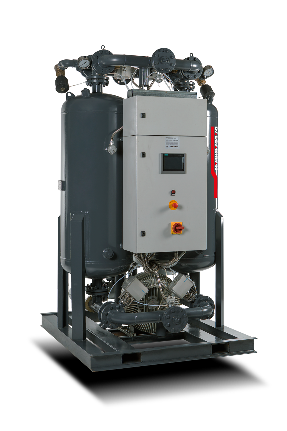 PLC STANDART DA Kimyasal Kurutcularda kullanılan çok güvenilir bir kumanda paneli sayesinde kurutucu, servis süresi boyunca mükemmel bir şekilde çalışır. Dokunmatik ekran tank geçişlerini ve gerçek zamanlı olarak üründe valf konumlarının çalıştığını gösterebilmektedir. (eğer çiğlenme noktası ölçerde mevcutsa (opsiyonel). Aynı zamanda çiğlenme noktasını da gösterir. (Uygulanırsa) Çok dilli kullanıcı dostu PLC herhangi bir alanda çalışan, bütün son kullanıcıların makinenin çalışmasını kolayca izleyebilmesini sağlar.